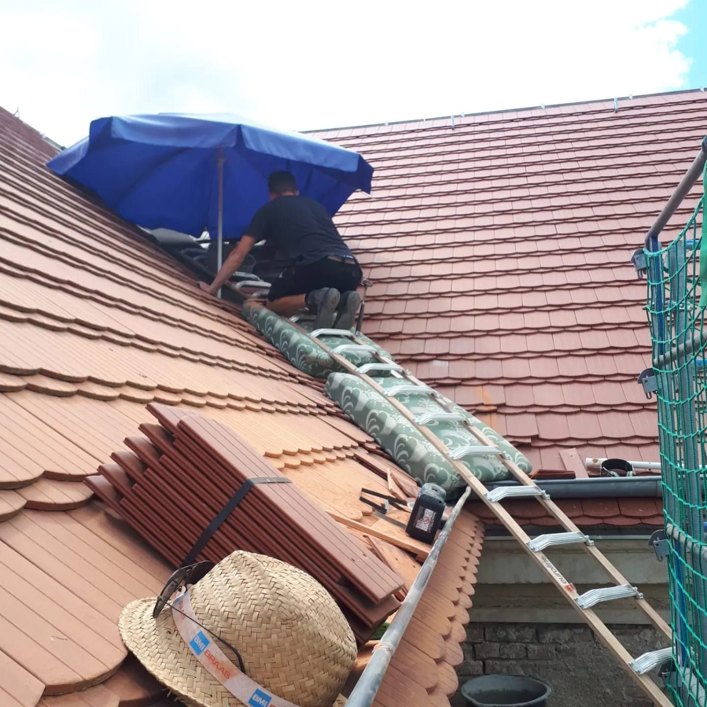 Wie auf den Detailaufnahmen zu sehen ist, wurde hier bewusst auf ein herkömmliches Kehlblech aus Metall verzichtet. Stattdessen haben wir eine sogenannte "eingebundene Kehle" ausgeführt. Dabei werden die einzelnen Ziegel in aufwendiger Handarbeit passgenau zugeschnitten und ineinandergelegt. Diese Technik ist zeitintensiver, führt aber zu einem optisch durchgehenden, harmonischen Dachbild ohne störende Blechübergänge und beweist hohes handwerkliches Können.